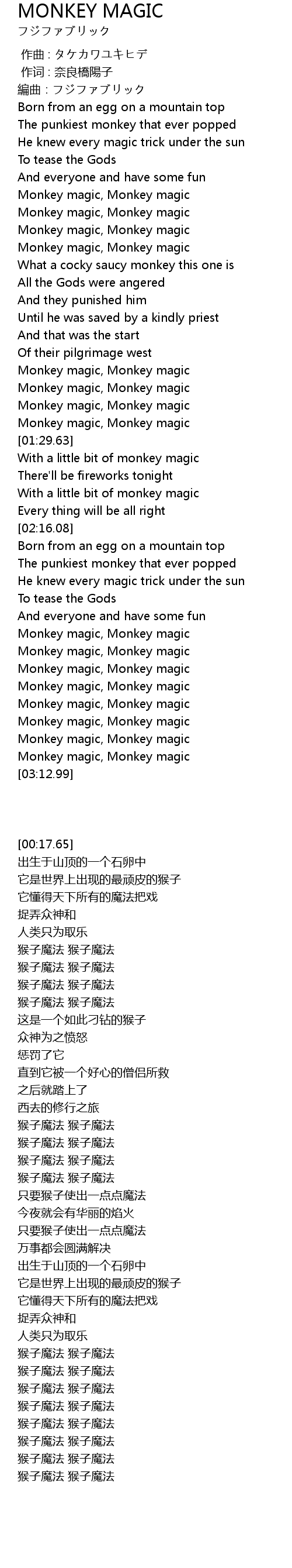 | [01:17.00] | Monkey magic, Monkey magic |