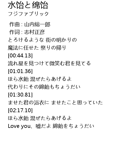 | [02:30.80] | Love you、嘘だよ 綿飴をちょうだい |