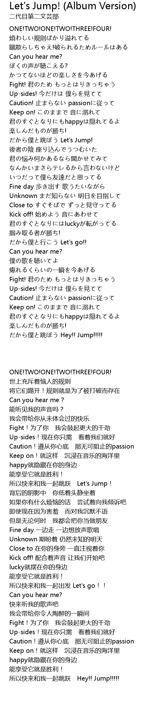 | [03:17.65] | だから僕と跳ぼう Hey!! Jump!!!!! |