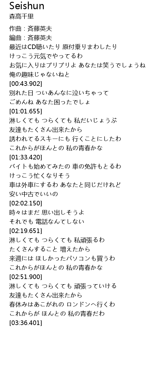 | [02:42.912] | これからがほんとの 私の青春かな |