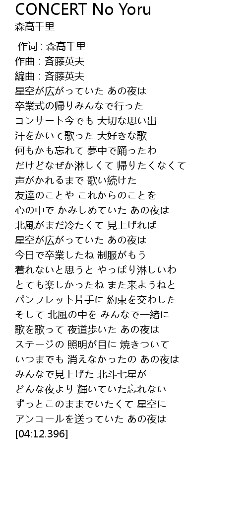 | [03:56.139] | ずっとこのままでいたくて 星空に |