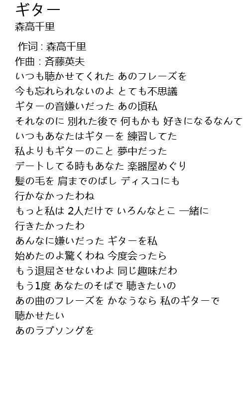 | [02:57.406] | あの曲のフレーズを かなうなら 私のギターで 聴かせたい |