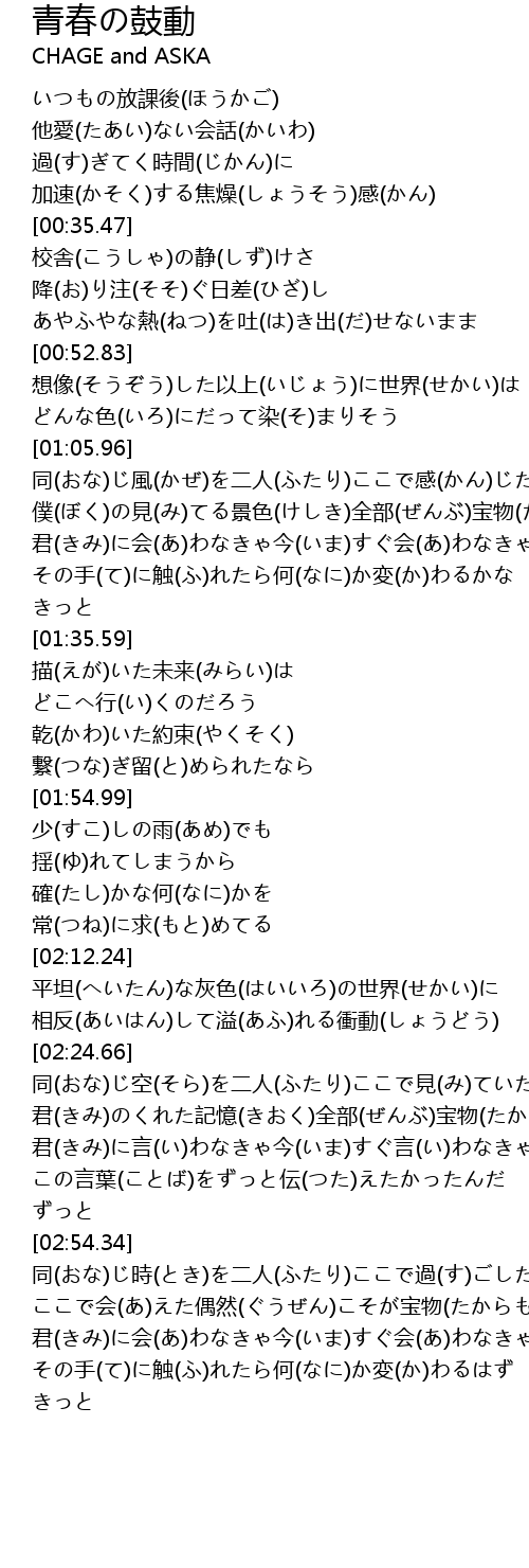 | [02:19.34] | 相反(あいはん)して溢(あふ)れる衝動(しょうどう) |