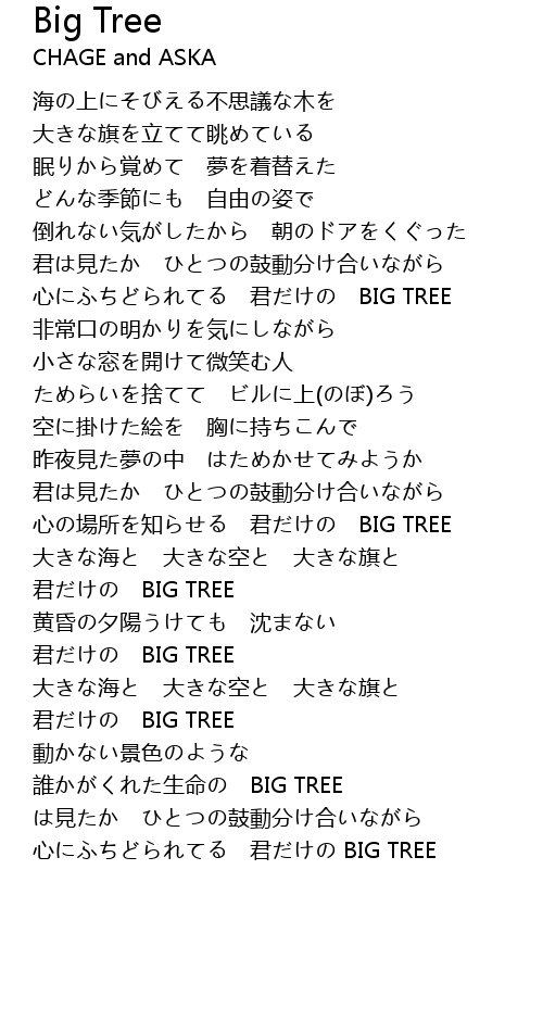 | [02:54.490] | 心の場所を知らせる 君だけの BIG TREE |