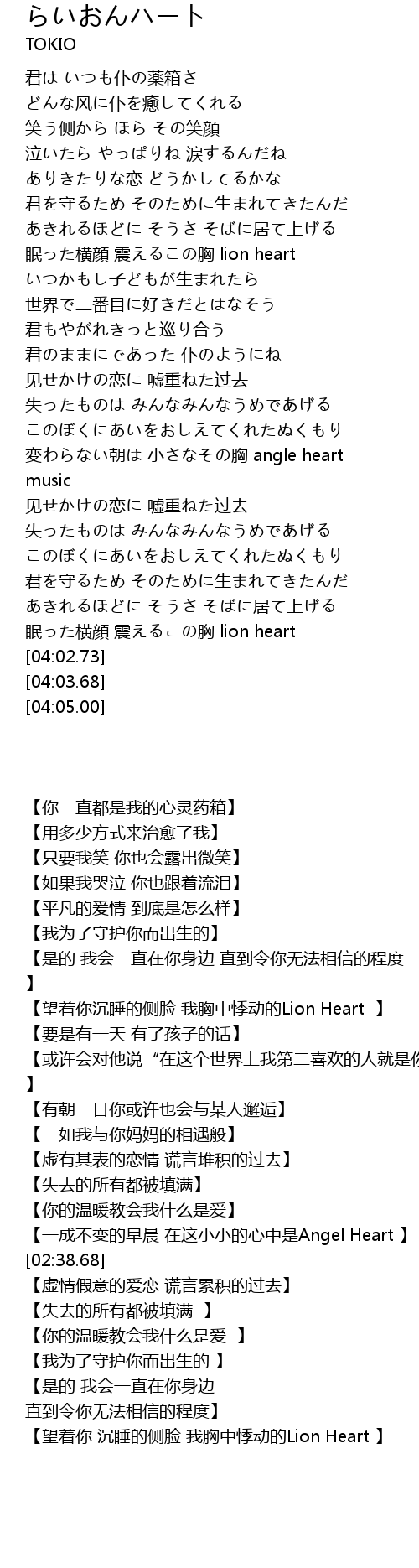| [03:31.72] | 眠った横顔 震えるこの胸 lion heart |