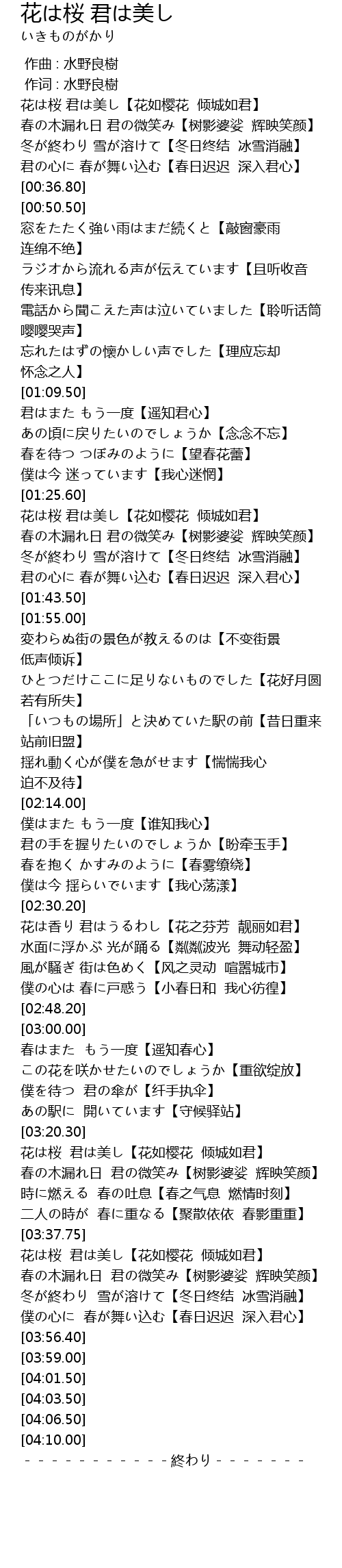 | [03:22.30] | 花は桜 君は美し【花如樱花 倾城如君】 |