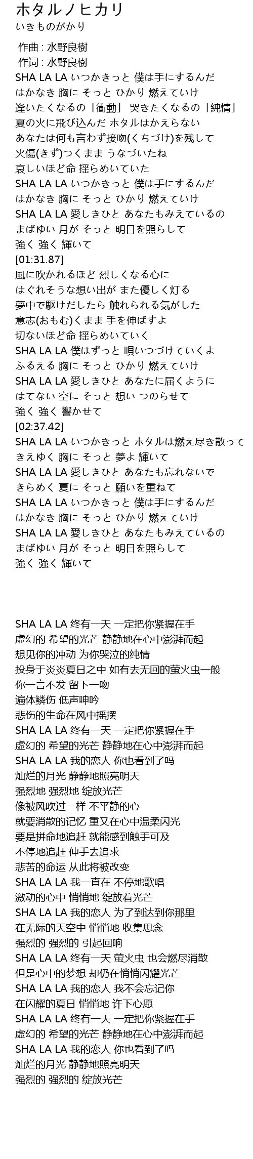 | [02:46.72] | SHA LA LA いつかきっと ホタルは燃え尽き散って |