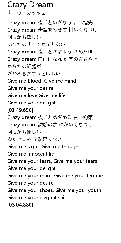 | [00:43.090] | Crazy dream 奇蹟をみせて 甘いくちづけ |