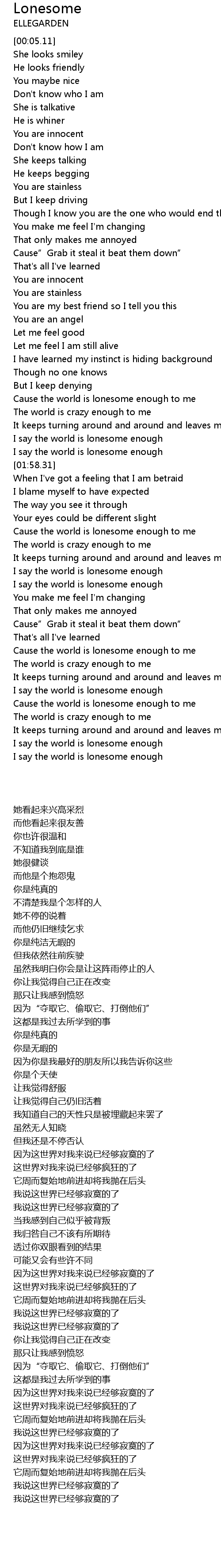 | [01:36.65] | Cause the world is lonesome enough to me |
