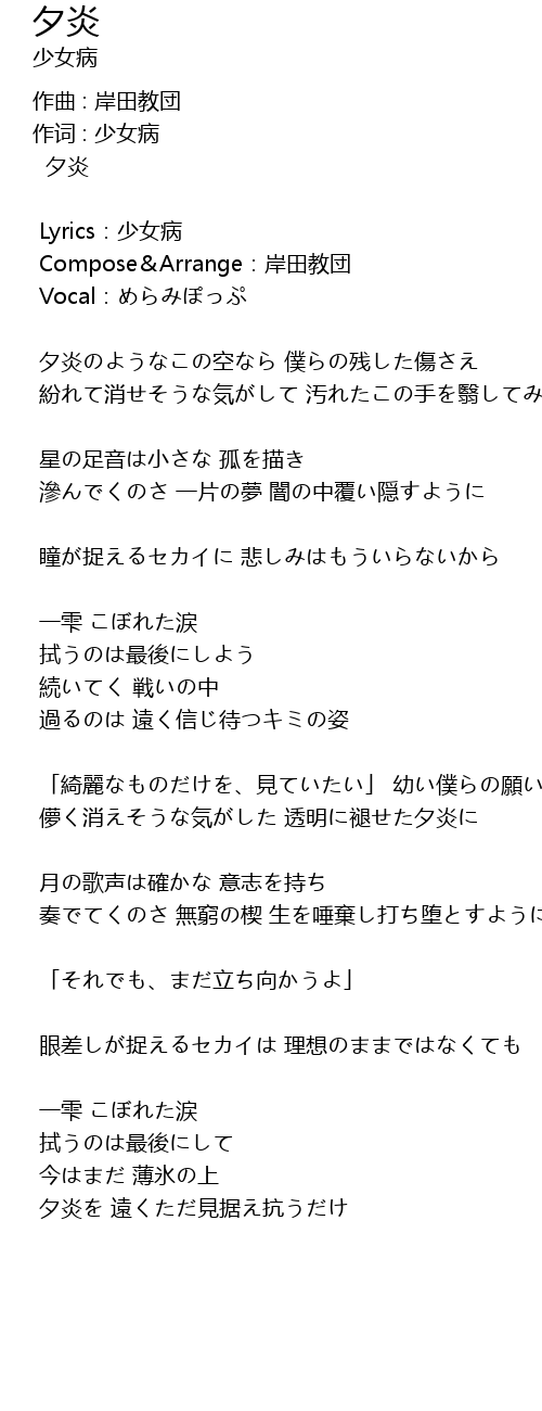 | 儚く消えそうな気がした 透明に褪せた夕炎に | |