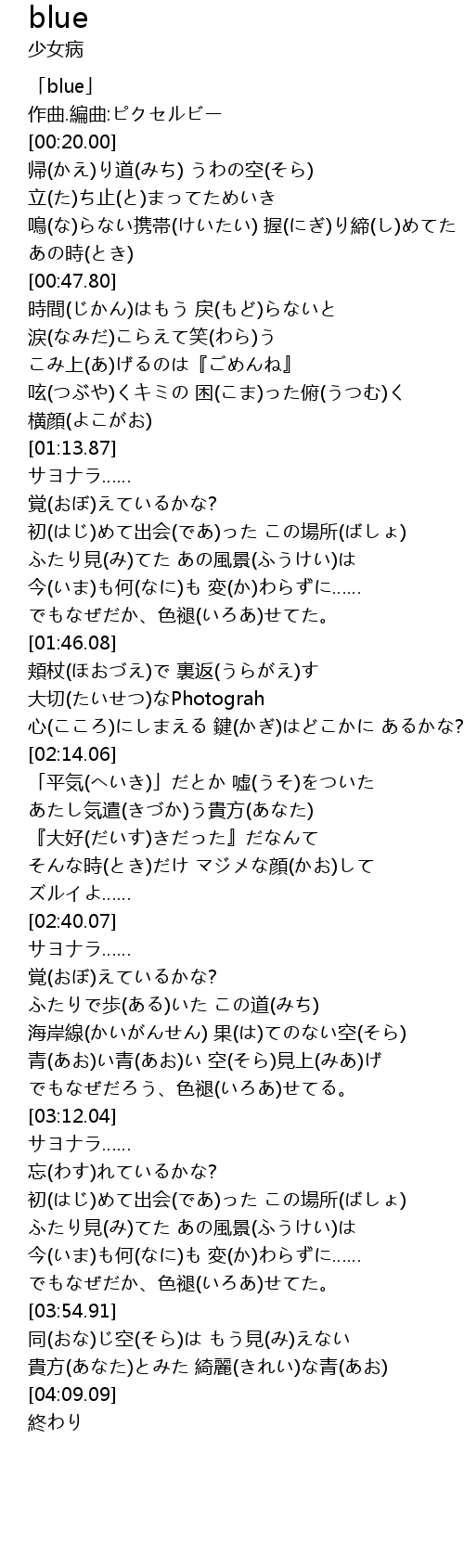 | [04:01.70] | 貴方(あなた)とみた 綺麗(きれい)な青(あお) |