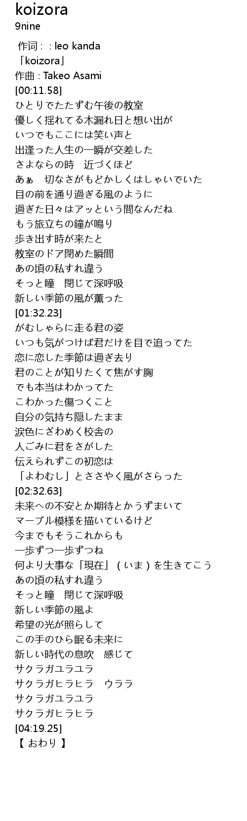 | [00:03.58] | 「koizora」 |