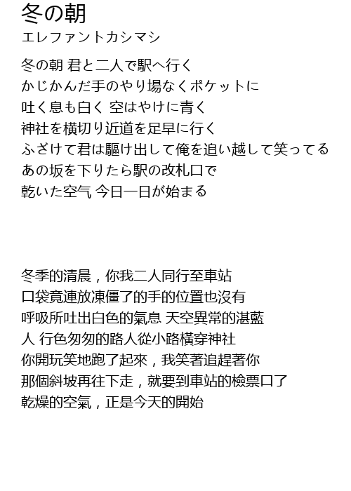 | [00:01] | 冬の朝 君と二人で駅へ行く |