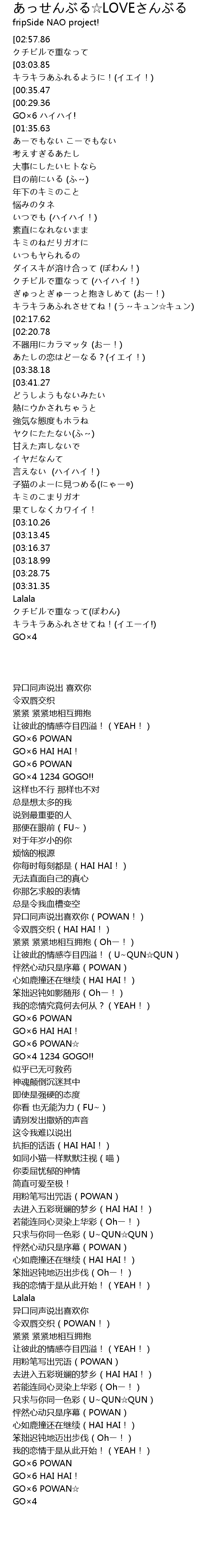 | [01:29.75][03:38.18] | GO×6 ハイハイ! |