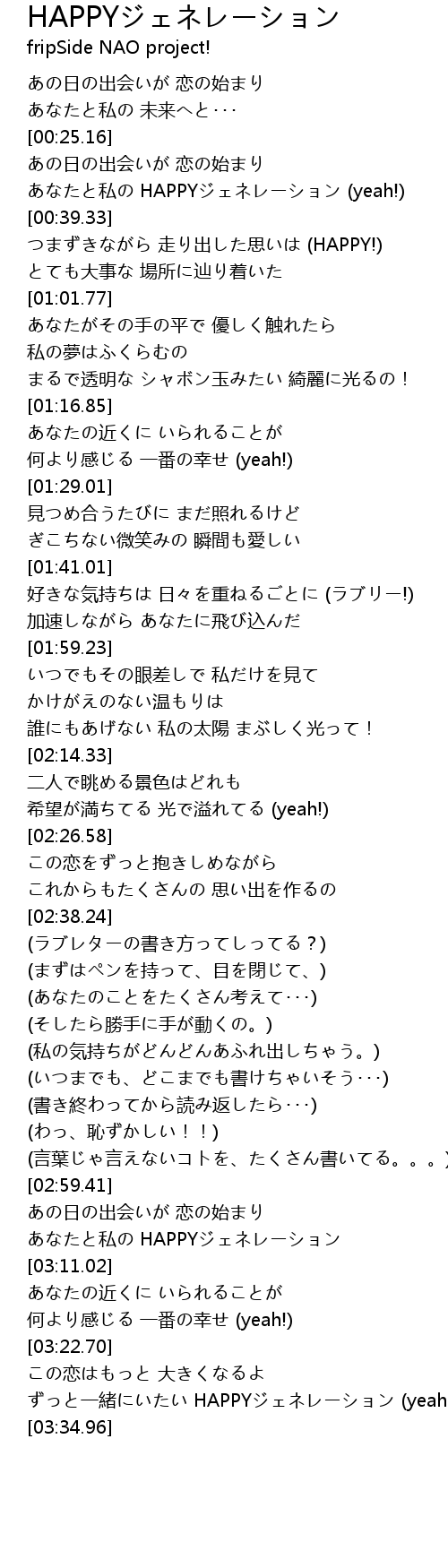 | [00:32.66] | あなたと私の HAPPYジェネレーション (yeah!) |