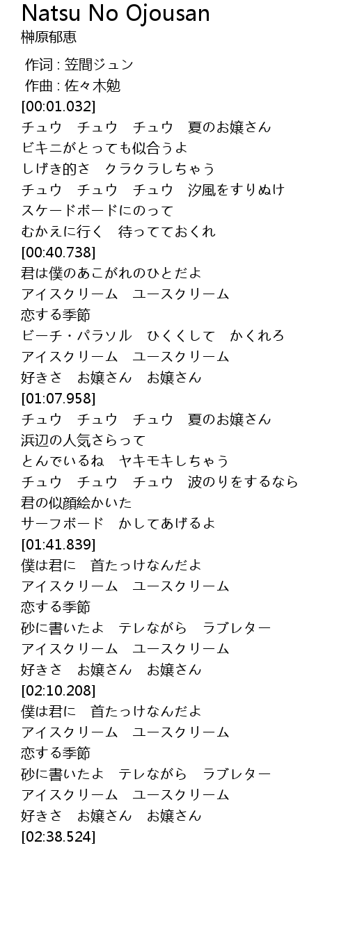 | [00:16.758] | チュウ チュウ チュウ 夏のお嬢さん |