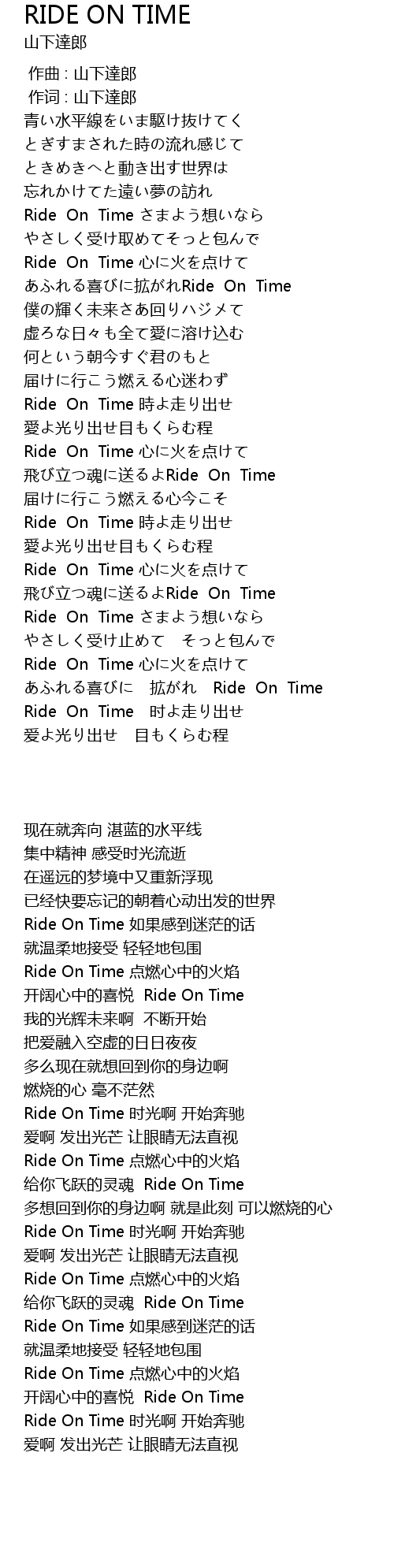 | [04:00.932] | Ride On Time shí zǒu chū |
