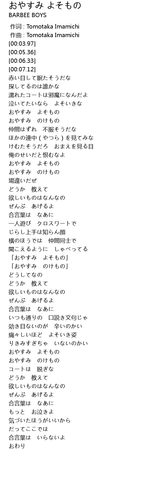 | [00:56.03] | おやすみ よそもの |