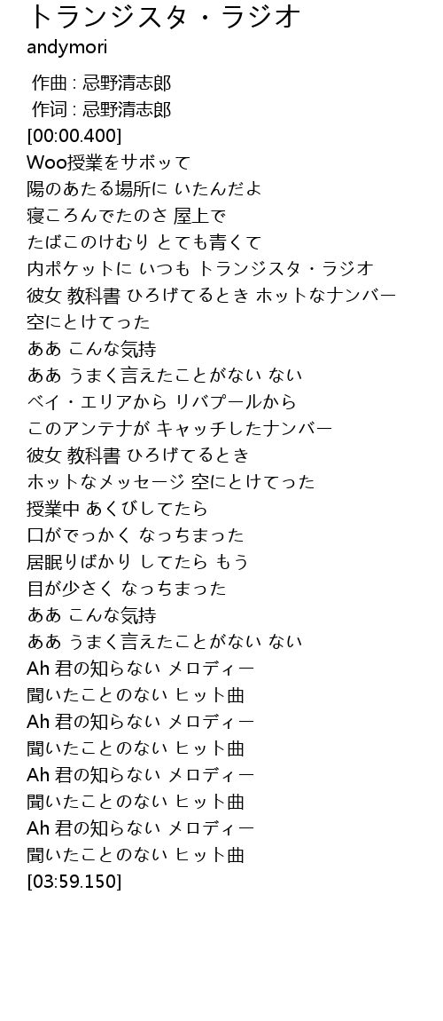 | [00:33.850] | 内ポケットに いつも トランジスタ・ラジオ |