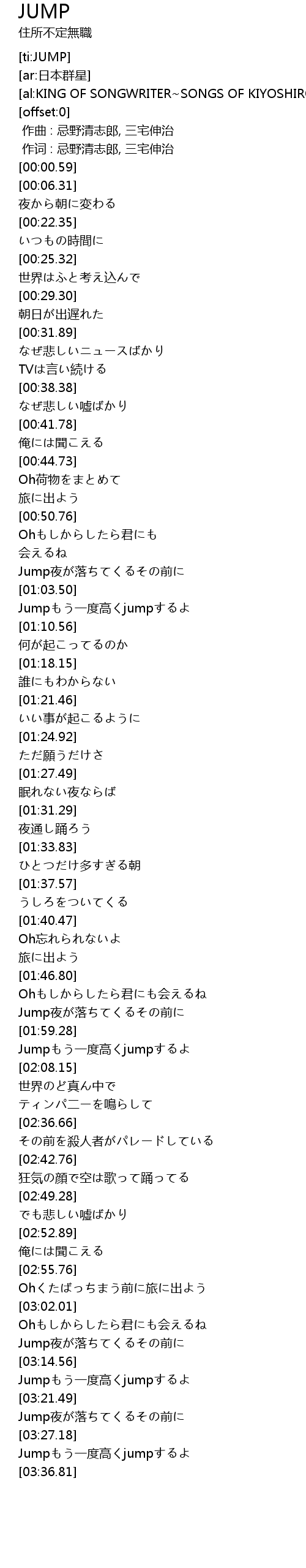 | [02:00.54] | Jumpもう一度高くjumpするよ |