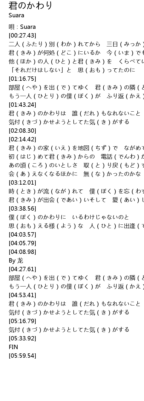 | [04:54.16] | 君(きみ)のかわりは 誰(だれ)もなれないこと |