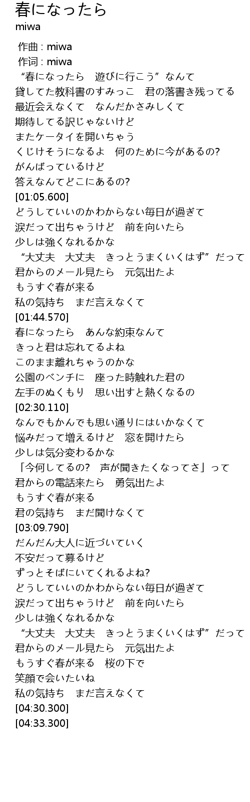 | [04:11.280] | もうすぐ春が来る 桜の下で |