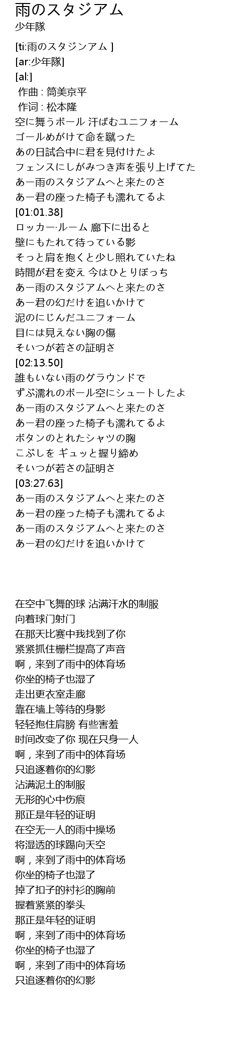 | [02:54.43] | あー雨のスタジアムへと来たのさ |