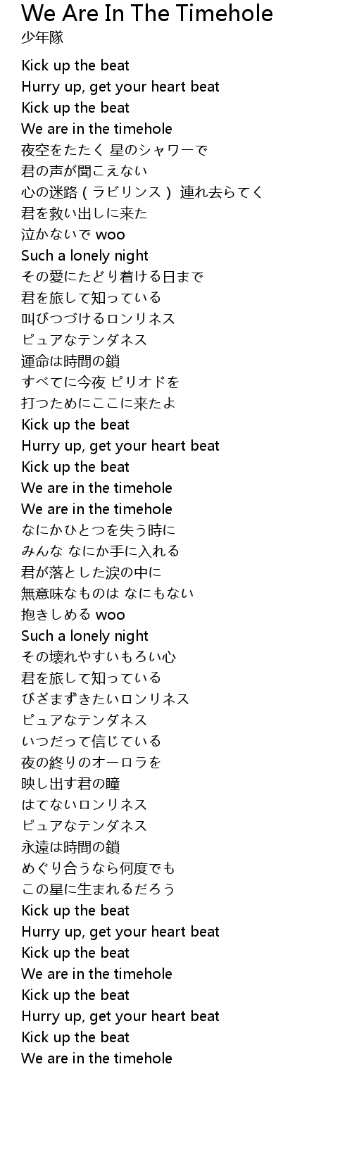 | [00:09.03] | Hurry up, get your heart beat |