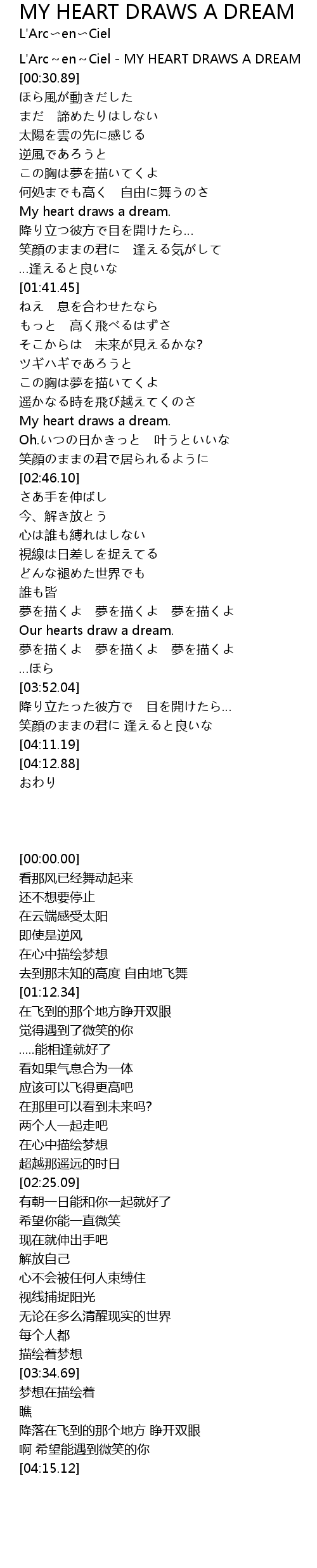 | [00:00.00] | L' Arc en Ciel MY HEART DRAWS A DREAM |