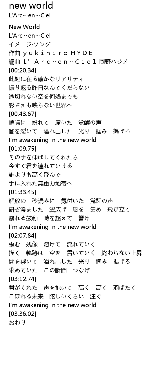 | [00:17.79] | 編曲 L’Arc~en~Ciel 岡野ハジメ |