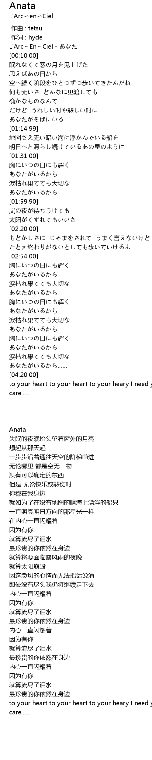 | [00:02.00] | L'Arc~En~Ciel - あなた |