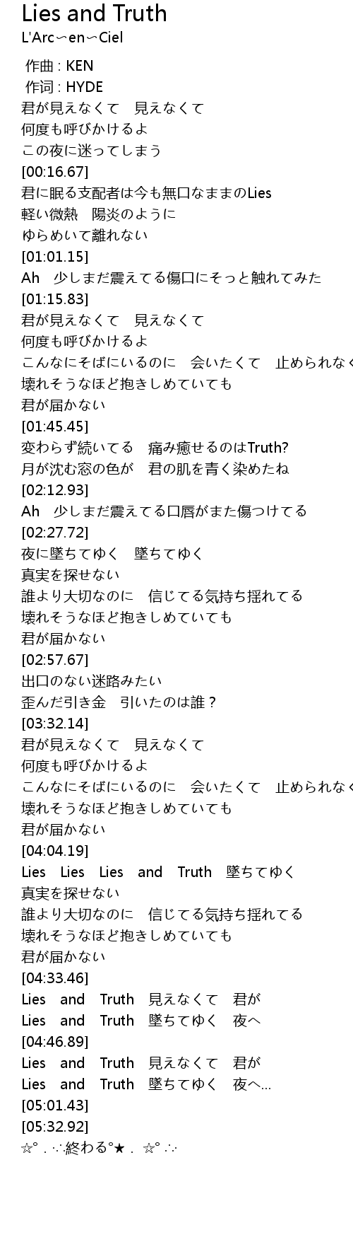 | [04:55.53] | Lies and Truth 墜ちてゆく 夜へ... |