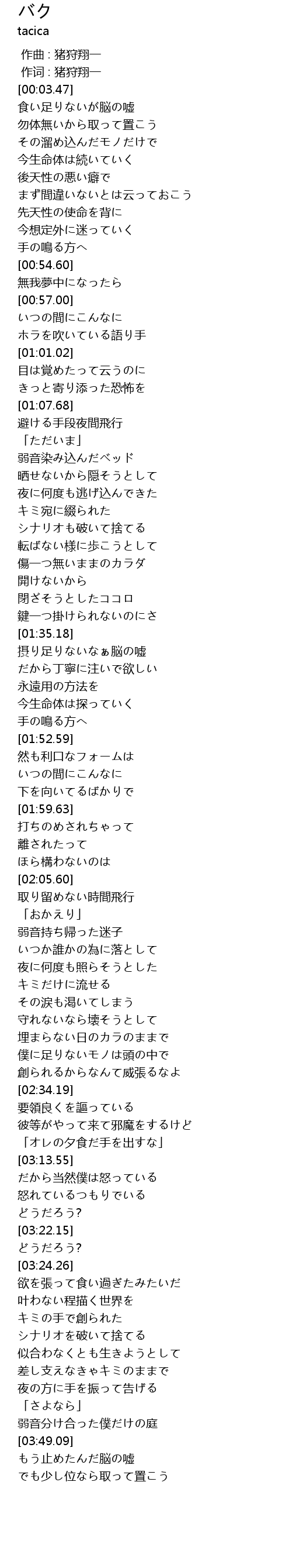 | [00:01.00] | 作词 : 猪狩翔一 |