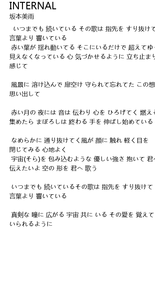 | いつまでも 続いているその歌は 指先を すり抜けて 言葉より 響いている | |