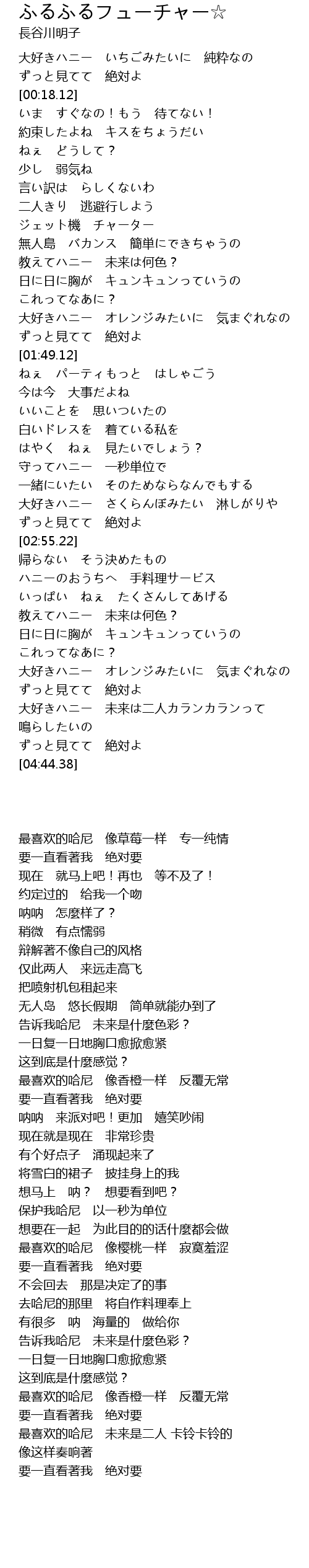 | [01:14.58] | 教えてハニー 未来は何色? |