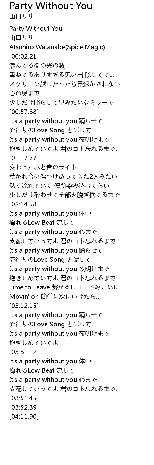 | [02:14.93] | It' s a party without you tǐ zhōng |