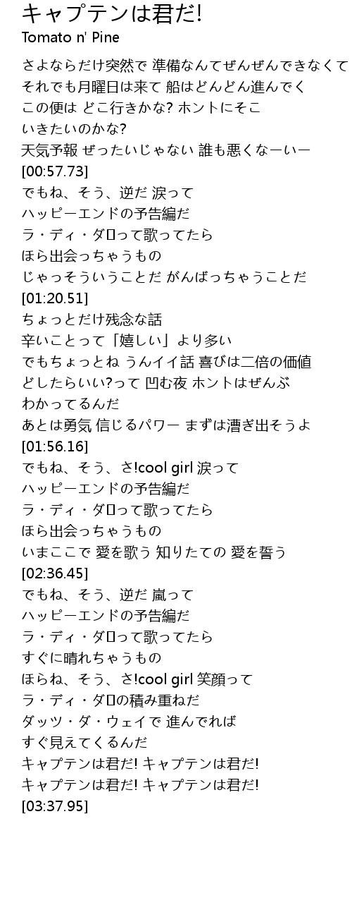 | [03:23.98] | キャプテンは君だ! キャプテンは君だ! |