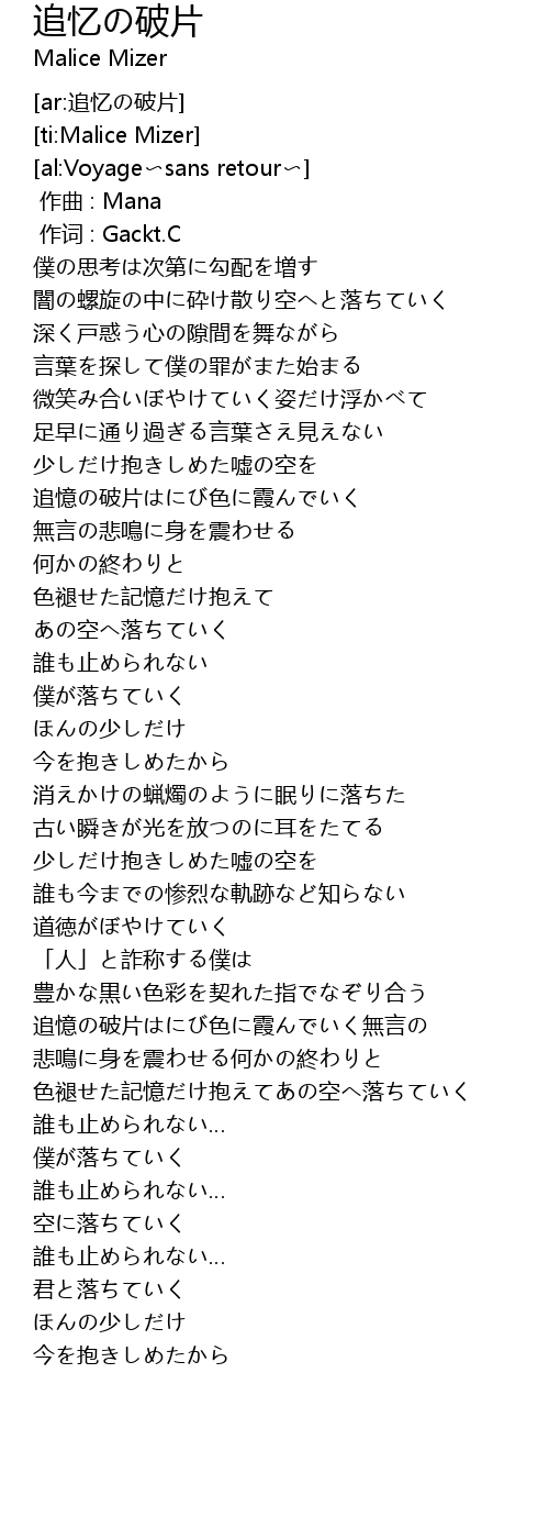 | [01:18.43] | 闇の螺旋の中に砕け散り空へと落ちていく |