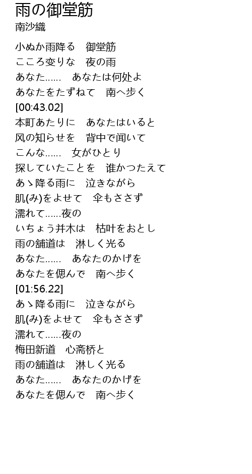 | [00:17.25] | 小ぬか雨降る 御堂筋 |