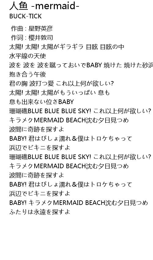 | [01:29.27] | キラメクMERMAID BEACH沈む夕日見つめ 波間に奇跡を探すよ |
