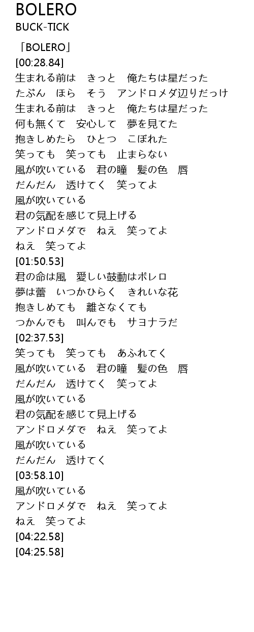| [02:08.21] | 君の命は風 愛しい鼓動はボレロ |