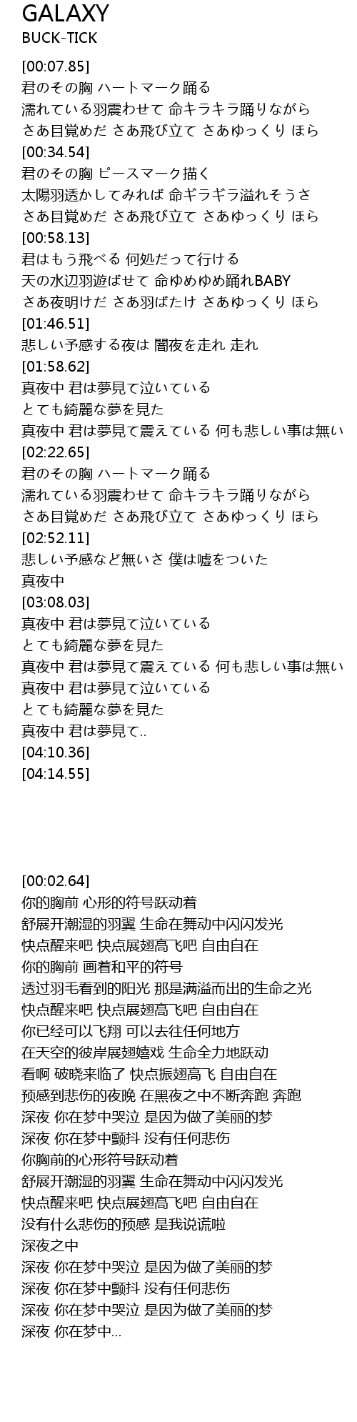 | [01:29.82] | 天の水辺羽遊ばせて 命ゆめゆめ踊れBABY |