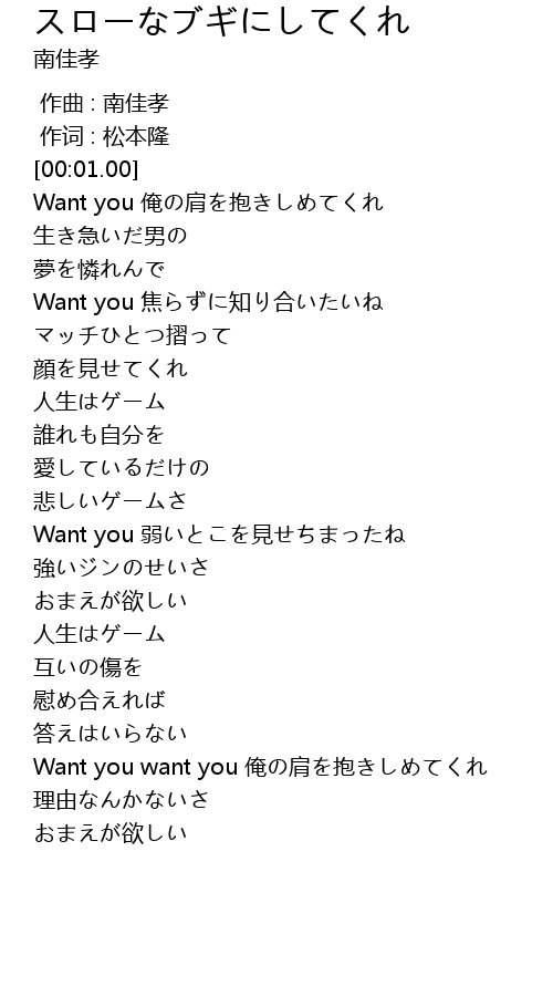 | [00:01.77] | Want you 俺の肩を抱きしめてくれ |