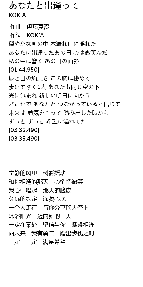 | [00:56.410] | あなたに出逢ったあの日 心は微笑んだ |