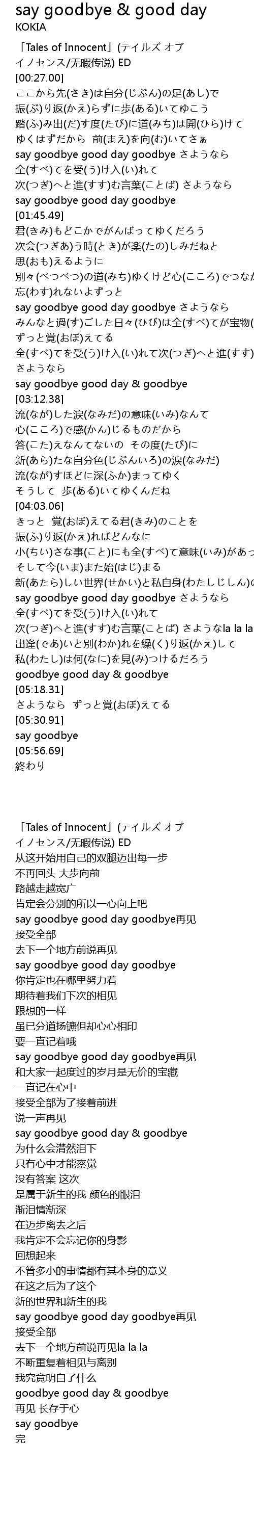 | [01:13.74] | say goodbye good day goodbye さようなら |