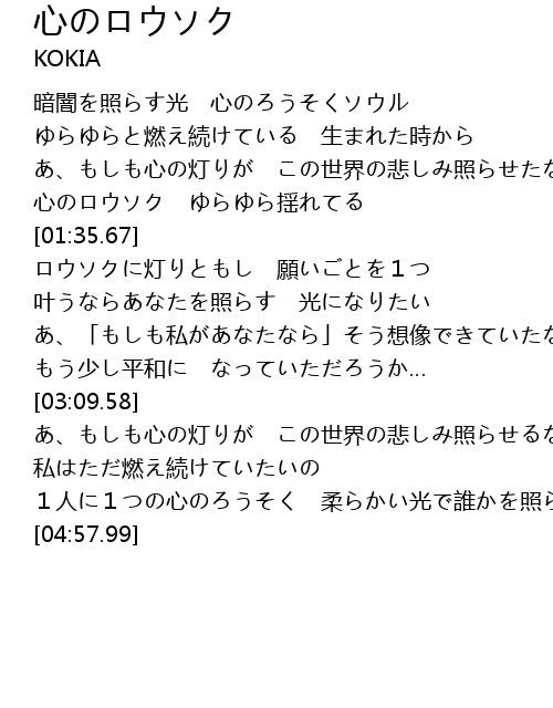 | [04:34.89] | 1人に1つの心のろうそく 柔らかい光で誰かを照らして |