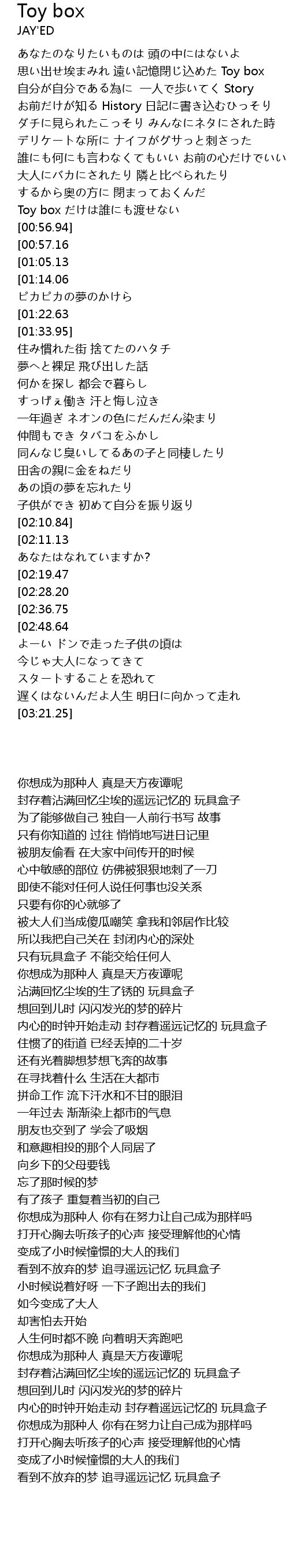 | [03:29.55][01:05.13] | 思い出せ埃まみれ サビついた Toy box |
