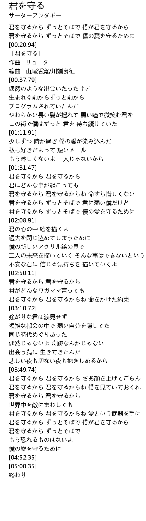 | [00:02.05] | 君を守るから ずっとそばで 僕が君を守るから |