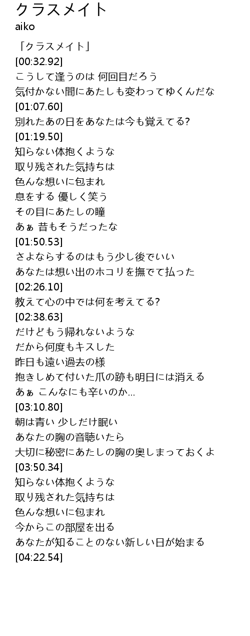 | [03:33.41] | 大切に秘密にあたしの胸の奥しまっておくよ |