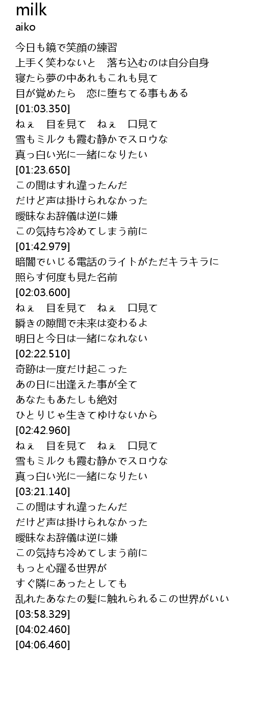 | [03:09.980] | 雪もミルクも霞む静かでスロウな |
